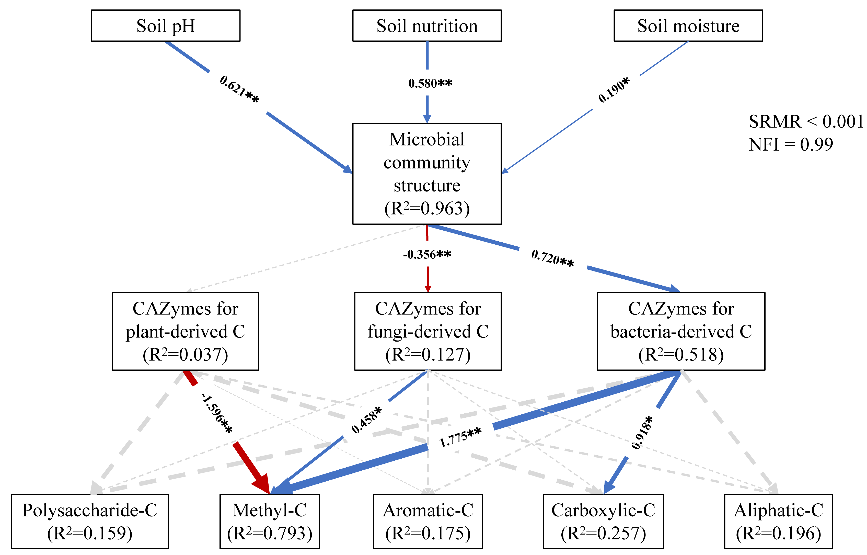 图2. CAZymes家族基因调控土壤碳组分变化的路径