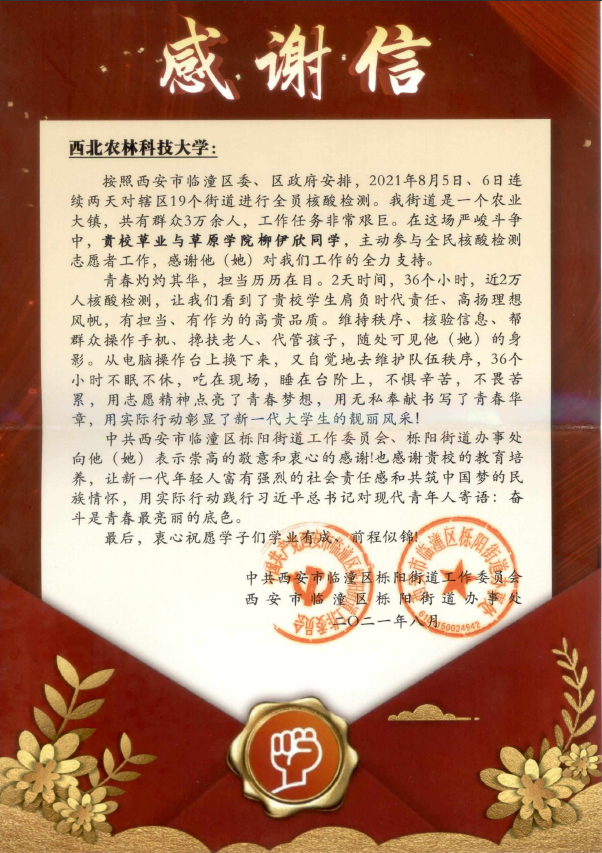 近日,我校新澳门六合彩内部资料 收到一封来自陕西省西安市临潼区栎阳街道党工委、办事处的感谢信,信中工作人员对新澳门六合彩内部资料 草业科学2021级新生柳伊欣同学在疫情期间主动投入一线参与全民核酸检测志愿者活动并给与了高度评价,对西北农林科技大学发来感谢信表达了衷心的感谢。