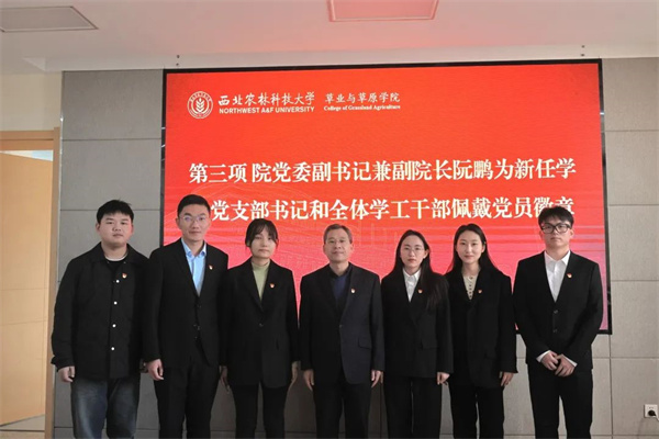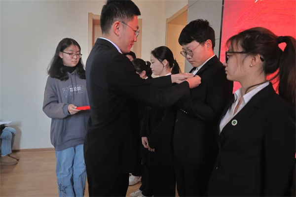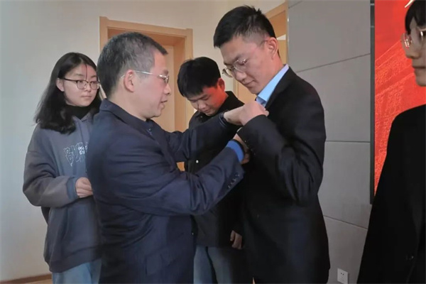 启动会上,新澳门六合彩内部资料 党委副书记兼副院长阮鹏老师为新任学生党支部书记和全体学工干部佩戴党员徽章。