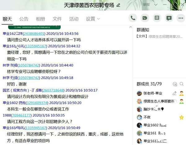 3月16日,新澳门六合彩内部资料 邀约天津绿茵景观生态建设股份有限公司通过“云课堂”成功举办网络云招聘宣讲会,来自草业、园林、林学、经管、植保、水建、机电、人文等新澳门六合彩内部资料 相关专业的近80名学生参加。
