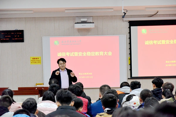 为严肃考风考纪,营造文明、诚信的良好学风氛围;为进一步提高学生安全意识,营造健康向上的校园文化氛围。新澳门资料 于12月12日下午在8号教学楼召开诚信考试暨安全稳定教育大会。新澳门六合彩内部资料 副院长杨培志、辅导员郭燕楠、全体2018、2019级本科生参加会议,会议由辅导员郭燕楠主持。