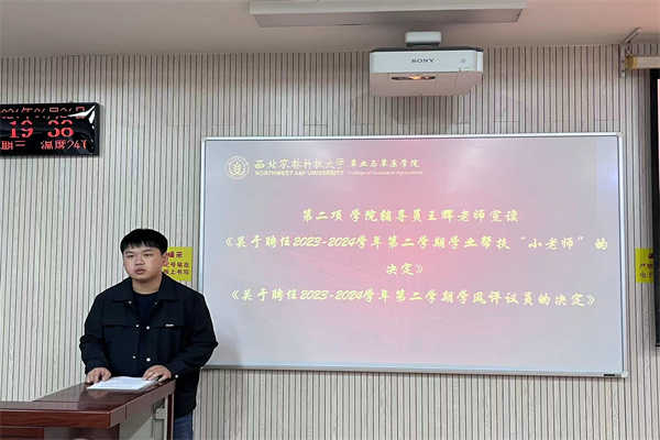 新澳门六合彩内部资料 团委副书记王辉老师宣读《关于聘任2023-2024学年第二学期学业帮扶“小老师”的决定》以及《关于聘任2023-2024学年第二学期学风评议员的决定》。